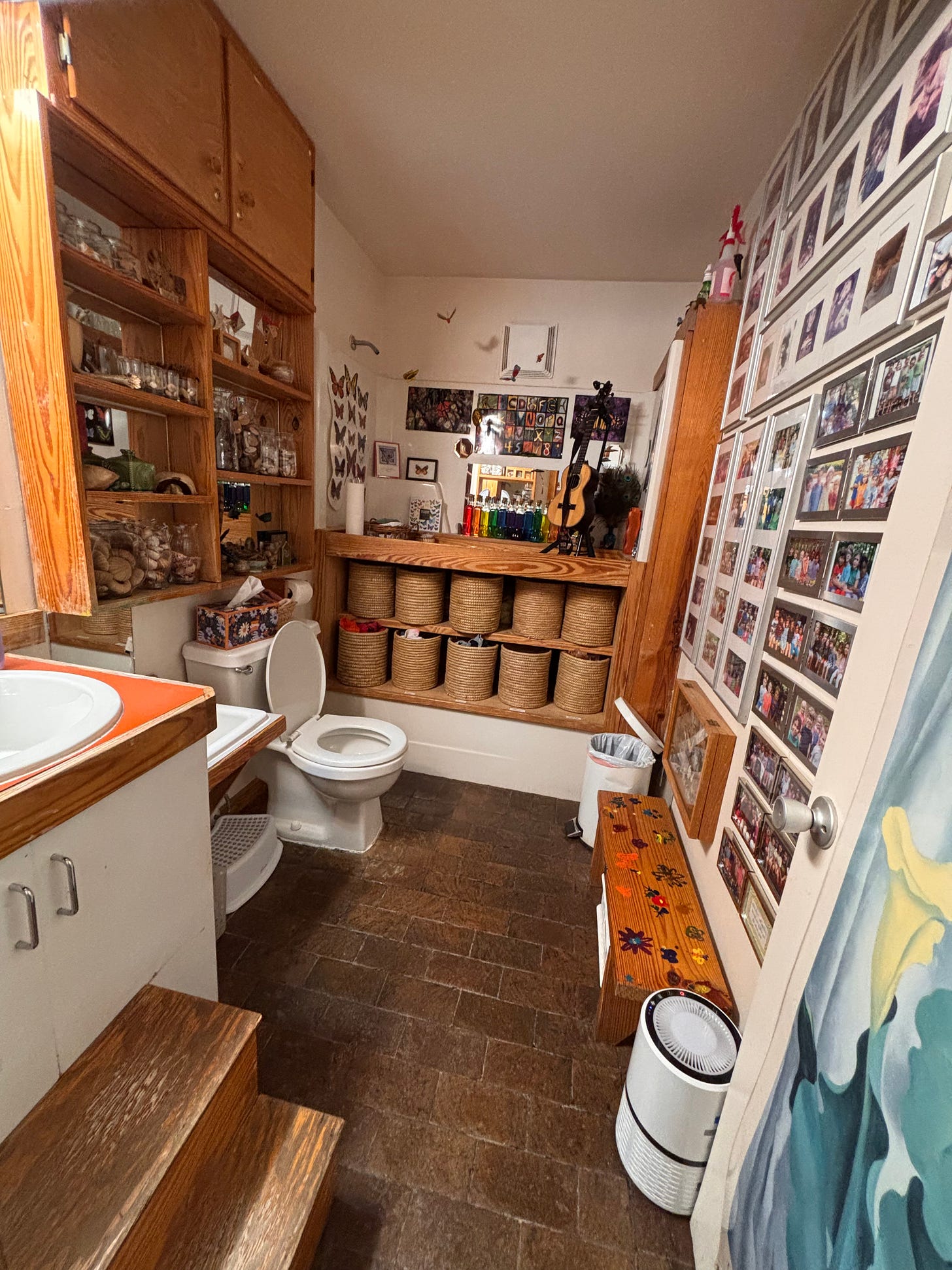 It’s not often that I notice a bathroom space in anything but its most functional sense - but this one captured me on first glance. It was warm and homey, which shouldn’t have surprised me: that was true of everything across the campus, itself an extension of Donna’s home (or is Donna’s home an extension of Children First? They are one.) Donna told us that she was committed to creating spaces where you weren’t worried about what you would run into if your eyes were to wander - an idea that has definitely troubled my relationship with my office space since I returned home. There is a small guitar and beautifully organized materials alongside images of a diverse and beautiful world. And sitting right across from the toilet - in the line of vision of anyone sitting on the seat - is photographs of every child who has gone to the school across its each of its years.